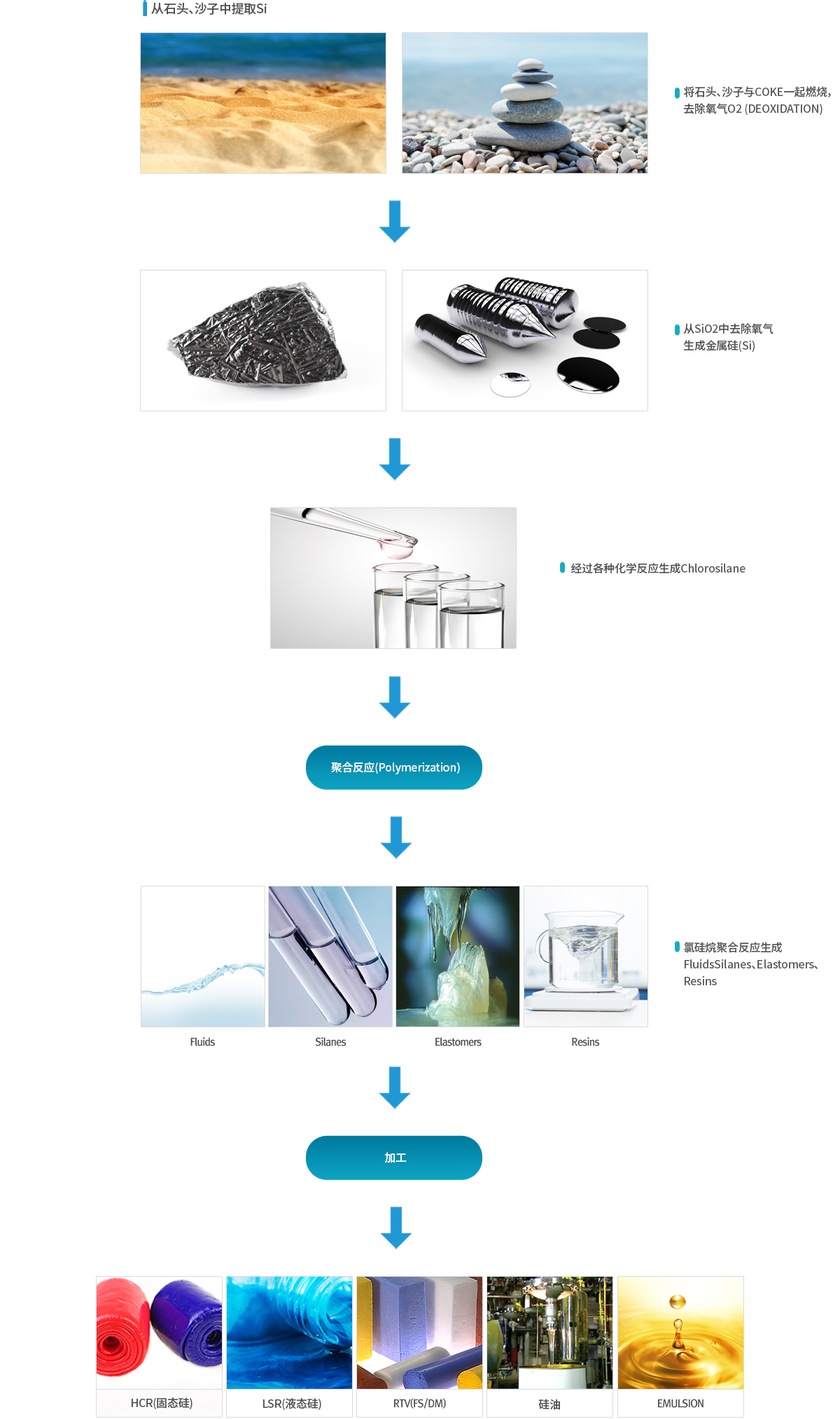 有机硅是以石头和沙子(SiO2)为原料,提取Si并通过硅氧烷键(Si-O-Si)连接而成的聚合物。 由于这种分子结构,它同时具有无机和有机性质。